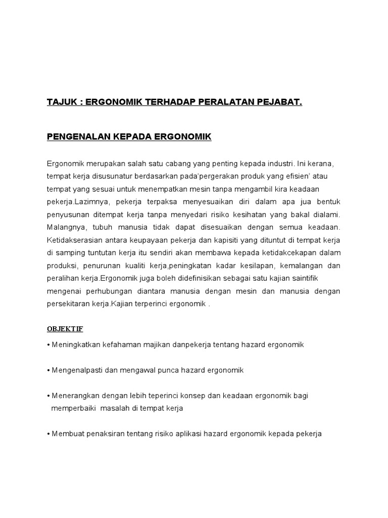 Dalam dunia kesihatan & keselamatan pekerjaan. Pelaksanaan dan penerapan ergonomi di tempat kerja di mulai dari yang sederhana dan pada tingkat individual terlebih dahulu. Kajian ini meninjau faktor stesen kerja ergonomik yang dapat menerangkan stres di tempat kerja. Ergonomik bagaimana untuk menyes uaikan keperluan kerja kepada kebolehan dan keupayaan manusia.board of certification for profession al ergonomists (bcpe),1993. Prinsip ergonomi adalah pedoman dalam menerapkan ergonomi di tempat kerja.