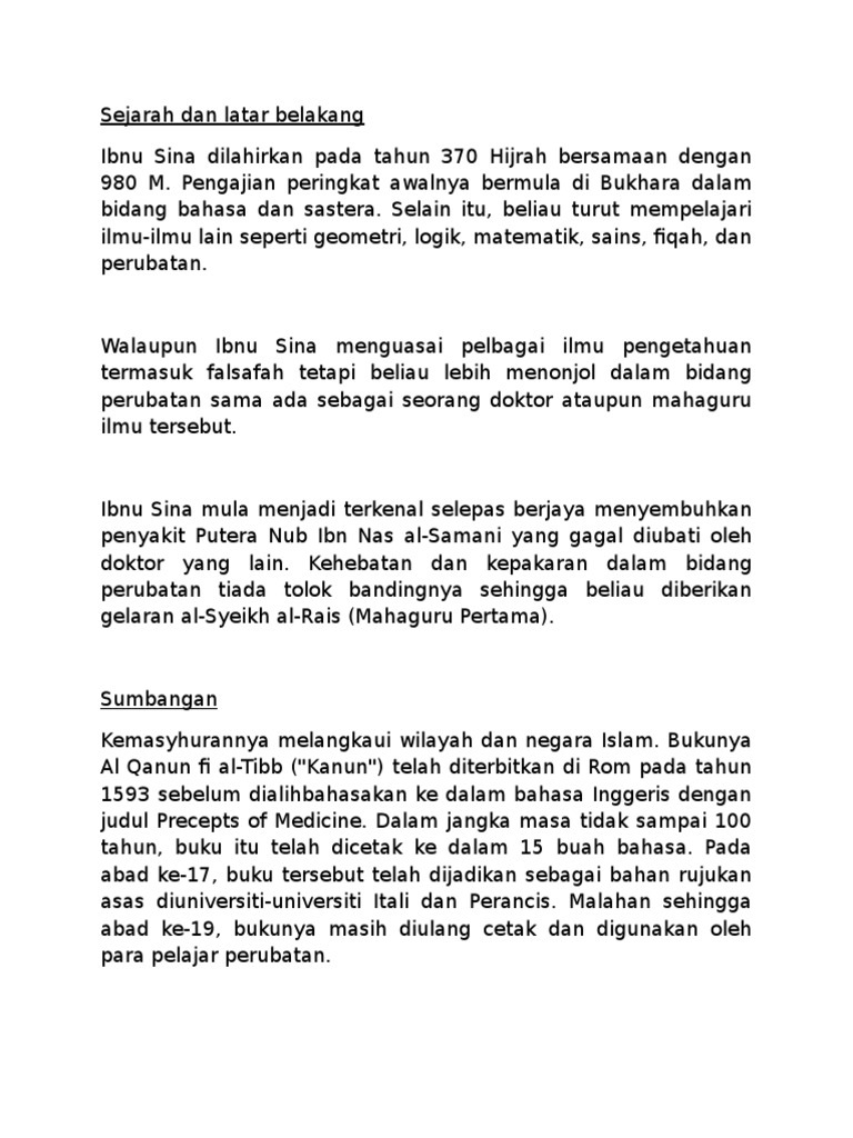 Ibnu Sina from imgv2-2-f.scribdassets.com Sumbangan dalam bidang ilmu dan pemikiran. Pada zaman ini , bidang perubatan adalah bidang pengkhususan yang sangat penting dengan wujudnya fakulti perubatan. Lahir pada tahun 370 h/980 m di bukhara. Ibnu sina dilahirkan sekitar tahun 980 a.d. Ibnu sina atau avicenna di barat dalah seorang ilmuan ulung islam yang mengubah bidang perubatan dunia. Tetapi di barat, beliau lebih dikenali sebagai avicenna. Ibnu sina lahir di afshona, yaitu salah satu daerah di uzbekistan. Hari ini kami akan kongsikan info tentang sumbangan ibnu sina dalam bidang perubatan.