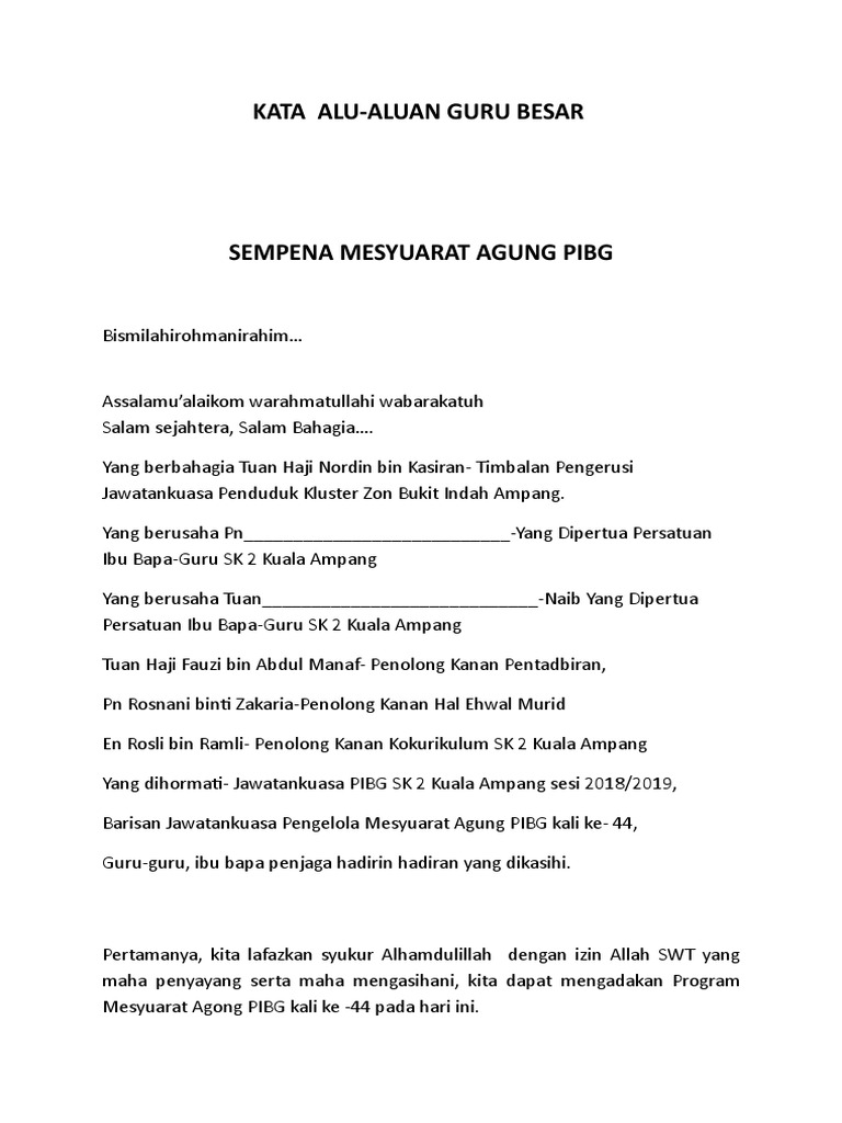 Ucapan Guru Besar Mesyuarat Agung Pibg - 2 mac 2013 mesyuarat agung pibg mesyuarat agung.. § ydp juga mengucapkan syukur kerana sudah 5 tahun kita mengadakan mesyuarat agung pibg ini di dewan terbuka skar yang selesa jika di bandingkan dengan 35 tahun dahulu. Ketibaan perasmi hj.taib bin yahya. Ucapan selamat hari guru 2020 daripada ydp pibg sksk. Nyanyian lagu kami guru malaysia dan ikrar guru. Ydp pibg sk kg baharu.