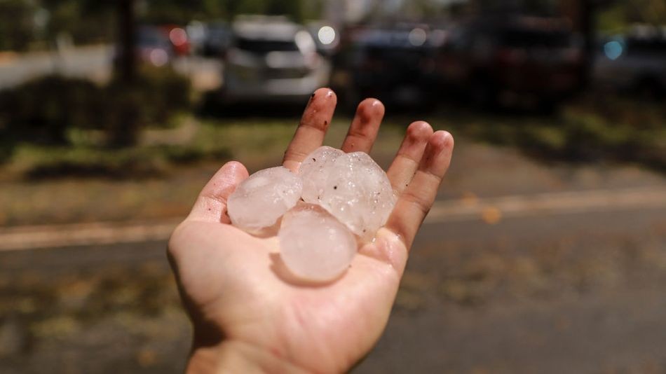 Satu video menunjukkan seorang lelaki di madinah memegang beberapa bola ais yang merosakkan bumbung suria keretanya.